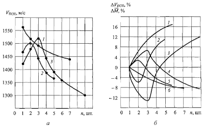 „The two graphs shown below illustrate the difference in the velocity limit of nominal defeat and the change in mass efficiency obtained by splitting homogeneous steel plate. The graph on the left (а), shows the change in the velocity limit of nominal defeat for three tested angles. (1) – 0 degrees; (2) – 30 degrees; (3) – 60 degrees. The graph on the right (б) shows the same, but in terms of percentage, where (1) – 0 degrees; (2) – 30 degrees; (3) – 60 degrees. Additionally, graph (b) shows the change in mass efficiency, where (4) – 0 degrees; (5) – 30 degrees; (6) – 60 degrees.”